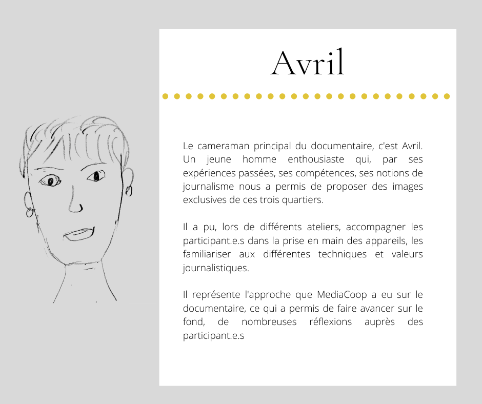 En ce qui concerne les pratiques artistiques, les participant.e.s ont pu s’essayer à la prise de photographie argentique, la rédaction du scénario, la prise de sons et d’images notamment des interviews réalisés, dont voici quelques extraits de leurs productions :