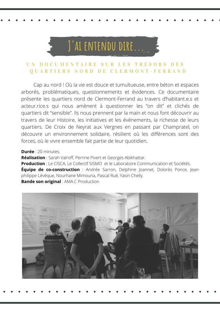 Né dans le cadre d’un projet de recherche-action, mené par le CISCA (Centre d’Innovations Sociales Clermont Auvergne) et en lien avec le Collectif SISMO et le Laboratoire Communication et Sociétés de l’UCA, ce documentaire s’inscrit dans une démarche expérimentale. Le but étant d’observer et d’analyser la manière dont un documentaire, co-construit avec différents acteur.rice.s, peut avoir un impact sur la représentation des sujets traités. Ici, le but est de mettre en avant le vécu et les visions des habitant.e.s et acteur.rice.s des Quartiers Nord et le faire visionner par un maximum d’habitant.e.s de la métropole clermontoise, de manière à rétablir l’image de ces quartiers. Mon rôle en tant qu’employé.e du CISCA a été de coordonner, animer et diriger la construction de ce documentaire. J’ai réalisé une méthodologie de recherche et tous les ateliers qui ont permis sa réalisation sur un an et demi. J’ai eu le plaisir de travailler avec Perrine Pivert et Georges Abikhattar pour les images et le montage du documentaire.