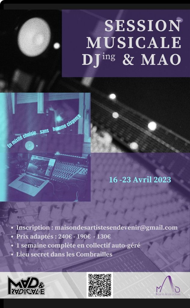 La première session musicale en mixité choisie sur l’initiation à la Musique Assisté par Ordinateur (MAO) et le Djing a eu lieu du 16 au 23 avril 2023. Durant une semaine, 13 personnes se sont donc retrouvées dans un lieu collectif non loin de Menat (63) pour développer leurs compétences et apprentissages sur le sujet. Pour la partie MAO, iels ont pu pendant trois jours suivre les enseignements de la productrice et DJ Peau d’Orange, Lou. Pour l’initiation au DJing, nous avions le plaisir de suivre ceux de Leïla, DJ LÄRMLY, bien connu dans le milieu musical alternatif.